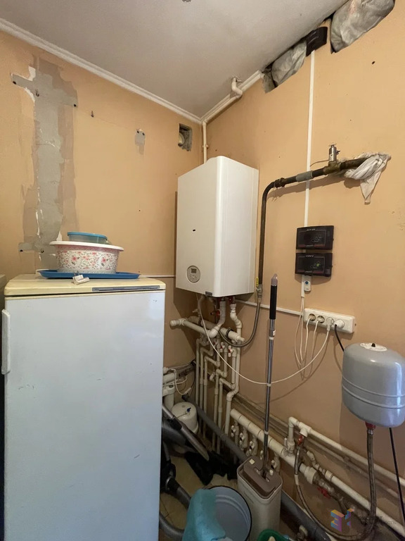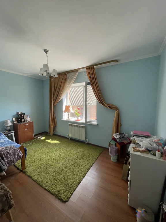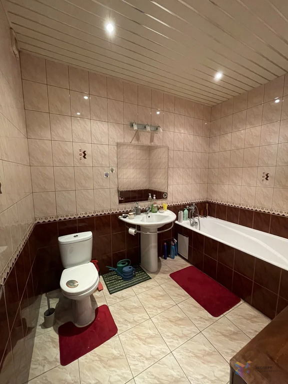 Дом размером 9 на 10 метров, блочный, облицован кирпичом. Фундамент ленточный, все коммуникации подведены: есть центральный газ, вода из колодца (10 колец), электричество и канализация.